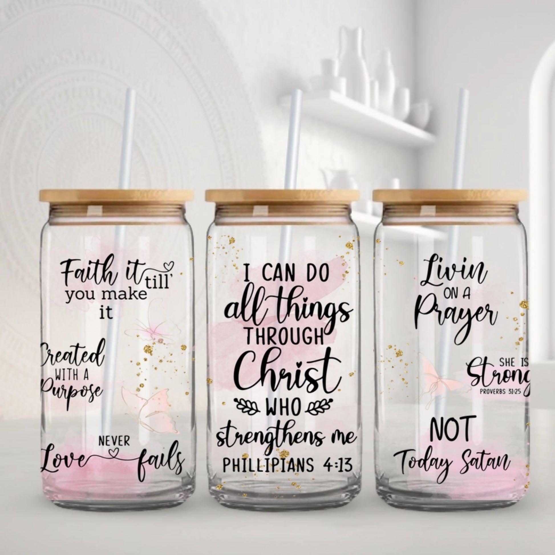 Raise your spirits with this playful 16oz custom glass cup featuring the empowering message, "I Can Do All Things Through Christ." Perfect for sipping your favorite drink while embracing confidence and faith, it’s a fun way to remind yourself that nothing is impossible!