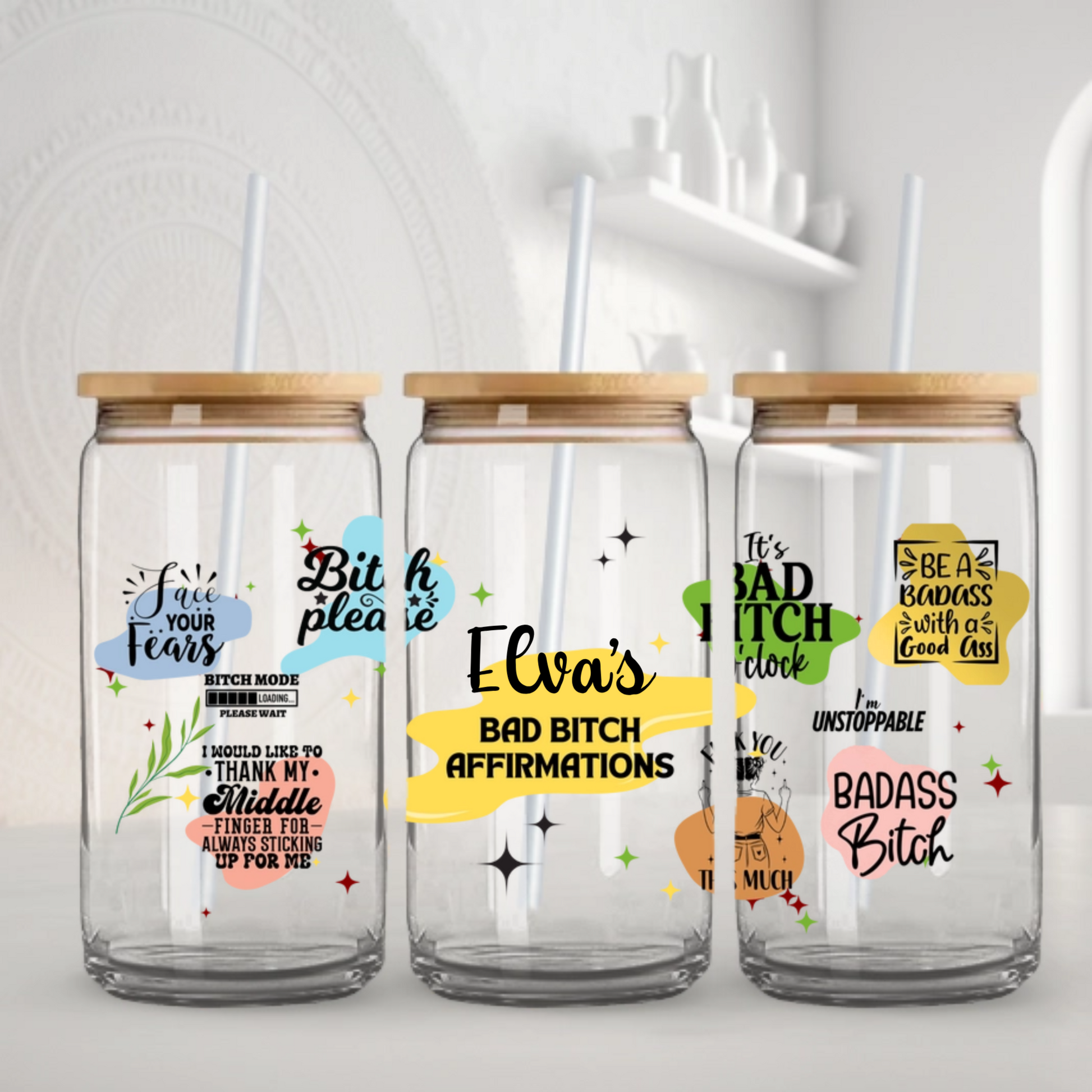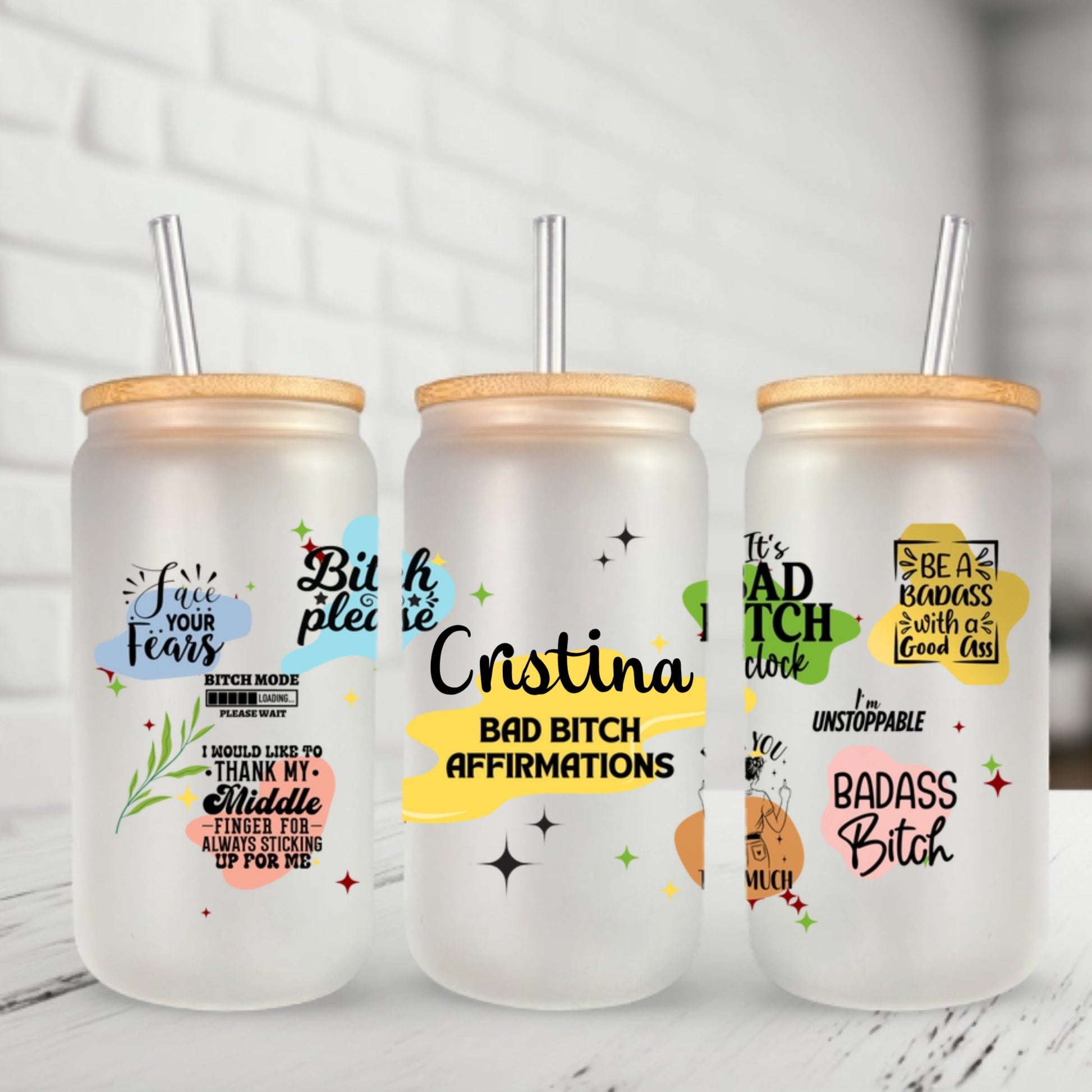 Sip in style with this 16oz personalized glass cup featuring bold Bad B*tch affirmations. Perfect for owning your confidence and making every drink a statement, this custom sipper adds a fun, empowering vibe to your daily routine. Cheers to being unapologetically you!
